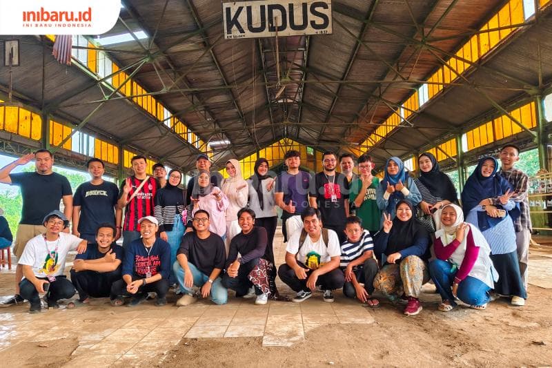 Para peserta walking tour berfoto bareng di gedung bekas Stasium Wergu di Kudus. (Inibaru.id/ Imam Khanafi)