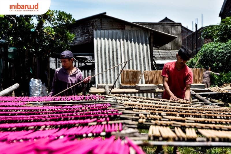 Yoyon dan Mamat sedang menjemur hio swa. (Inibaru.id/ Audrian F)<br>