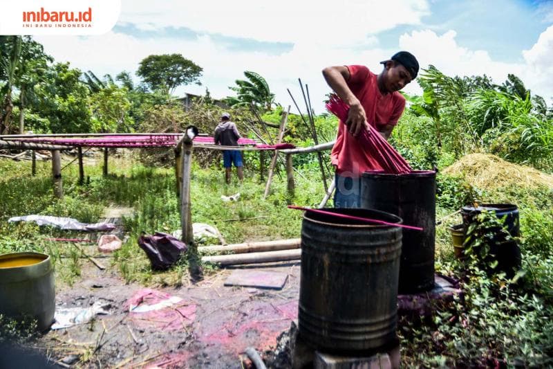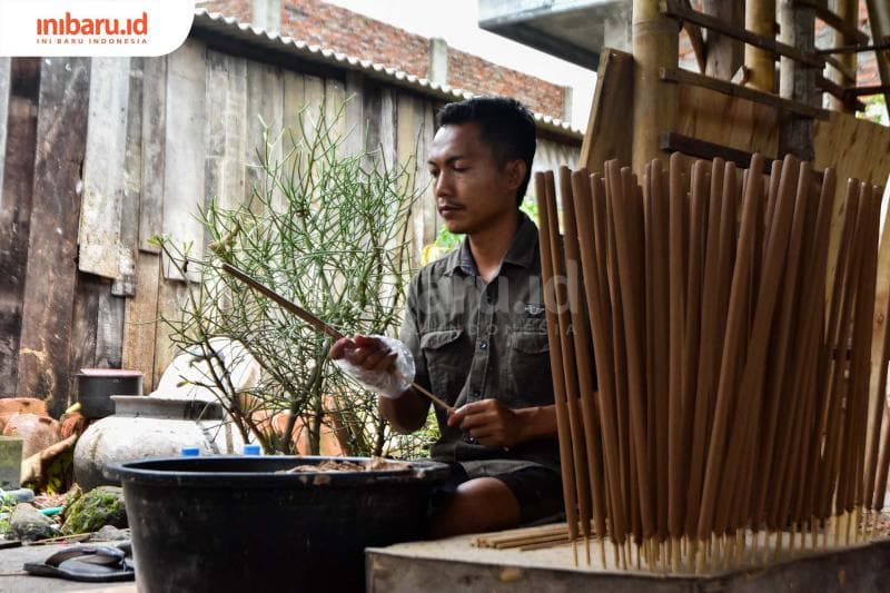 Khundhori sedang melumuri batangan bambu dengan adonan serbuk jati. (Inibaru.id/ Audrian F)