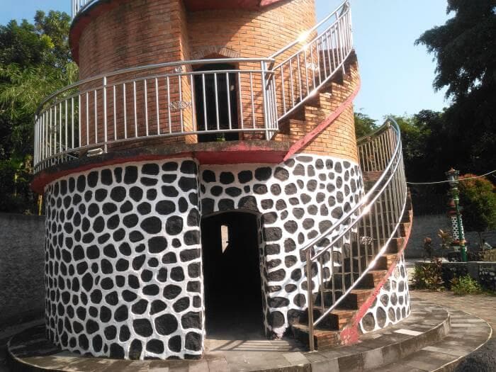Menara ini memiliki tinggi 11 meter dengan betuk silinder yang mengecil dari dasar sampai ke bagian atas, mirip-mirip tumpeng gitu. Yang unik, ada anak tangga yang dibangun melingkar di luar dinding menara. Bentuknya pun jadi mirip seperti rumah keong yang diposisikan berdiri.