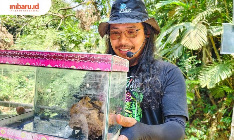 Setyawan Rahayu atau Wawan sedang mengedukasi masyarakat dengan menunjukkan ciri khas Cecak Batu Muria. (Inibaru.id/ Imam Khanafi)
