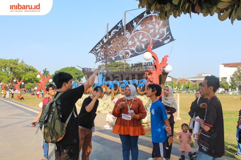 Peserta walking tour sedang mendengarkan cerita di depan Monumen Kapal Jung. (Inibaru.id/Imam Khanafi)