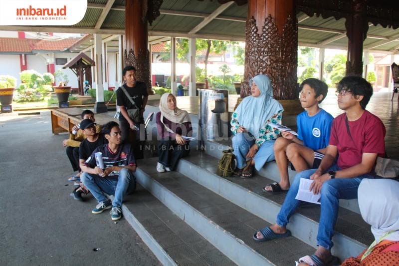 Peserta walking tour sedang mendengarkan cerita Susi, tentang Sekolah Teras Kartini di teras pendopo Kabupaten Jepara. (Inibaru.id/Imam Khanafi)