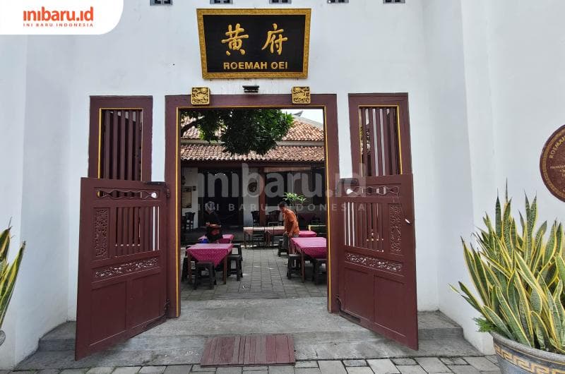 Inibaru.id - Gerbang cokelat tua itu berdiri kukuh di Jalan Jatigoro No 10, Desa Karangturi, Kecamatan Lasem, Kabupaten Rembang, seperti menyapa siapa saja yang lewat dengan keanggunan masa lalu. Tulisan Tionghoa berwarna emas di daun pintu seolah menyimpan cerita panjang yang belum selesai dibacakan.