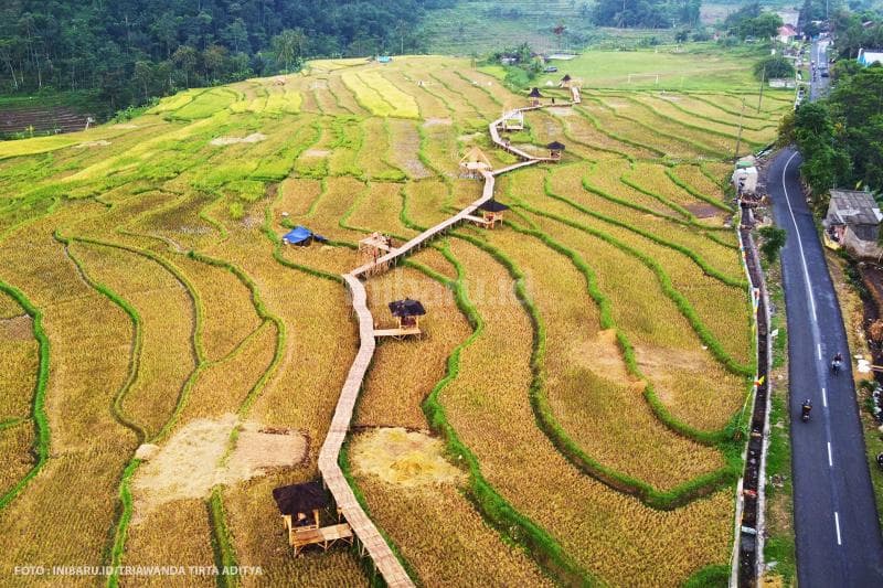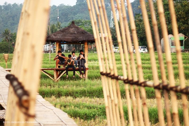 Sepeminuman teh berteduh, hujan reda. Saya pun bergegas masuk, membayar tiket sebesar Rp 10 ribu di loket, lalu mulai meniti jembatan sepanjang sekitar 150 meter. Di kanan dan kiri jembatan, ada enam gubuk yang bisa kamu singgahi. Sekelilingnya, areal persawahan terhampar: sebagian masih ditanami padi, sisanya sudah dipanen.