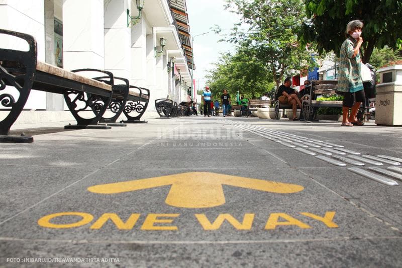 Jalur untuk pejalan kaki juga diberi tanda bertuliskan "One Way" untuk mengurangi risiko kontak fisik antar wisatawan.