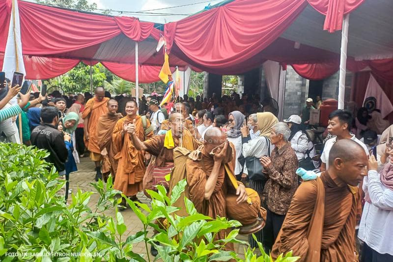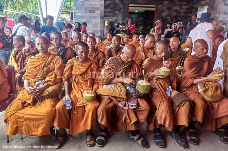 Dentuman rebana dan lantunan selawatan menyambut kedatangan para biksu di Vihara Buddhadippa. Meski saat itu cuaca sangat panas, banyak warga berkerumun, menyambut mereka ramah. Gayung bersambut. Para biksu juga terlihat semringah. Sesekali mereka menerima ajakan berswafoto.