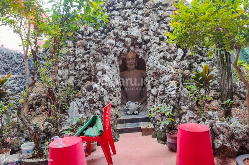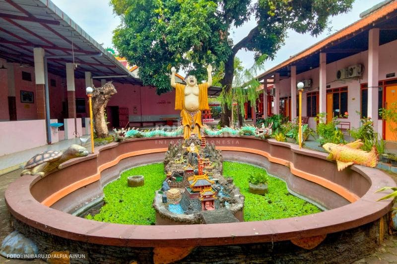 Gebyok Ukir Jepara di Mata Amim MustafiSelain itu, Suwoto mengimbuhi, pada bagian belakang klenteng juga berdiri patung Buddha Maitreya (Buddha Tertawa) yang dikelilingi danau kecil dan hewan-hewan melata. Ini menjadi gambaran bahwa manusia yang tidak menjalankan perintah dari lahir akan terlahir kembali ke alam setan atau karma.