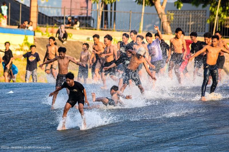 “Ini sudah yang kedua (berselancar di BKB). Lihat di Instagram, kok sepertinya seru dan keren!” seru lelaki 16 tahun ini sembari bergegas menuruni tangga, menyusul teman-temannya yang sudah lebih dulu tiba di sisi atas perosotan.