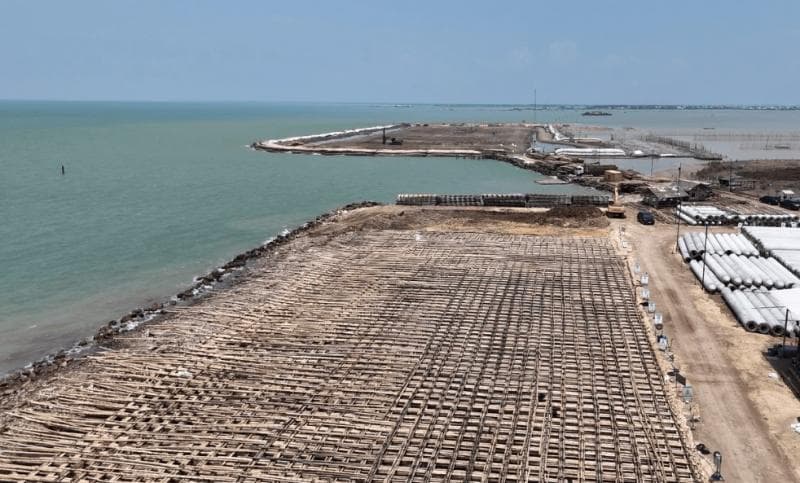 Yang pasti, setiap lapisan rakit bambu diberi pasir laut oleh kapal isap pasir laut dengan ketebalan 20 cm pada bagian atasnya sebelum kemudian ditumpuk lagi dengan rakit bambu lainnya. Hal ini terus dilakukan sampai 17 lapis rakit juga tertutup dengan pasir laut.