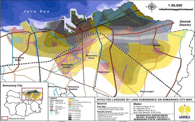 “Penurunan permukaan tanah di Semarang bagian utara mencapai 2 sampai 8 sentimeter setiap tahun,” ucap Dr Rahma Hayati MSi, seorang dosen jurusan geografi Universitas Negeri Semarang sebagaimana dilansir dari Kampusnesia, (28/7/2021).