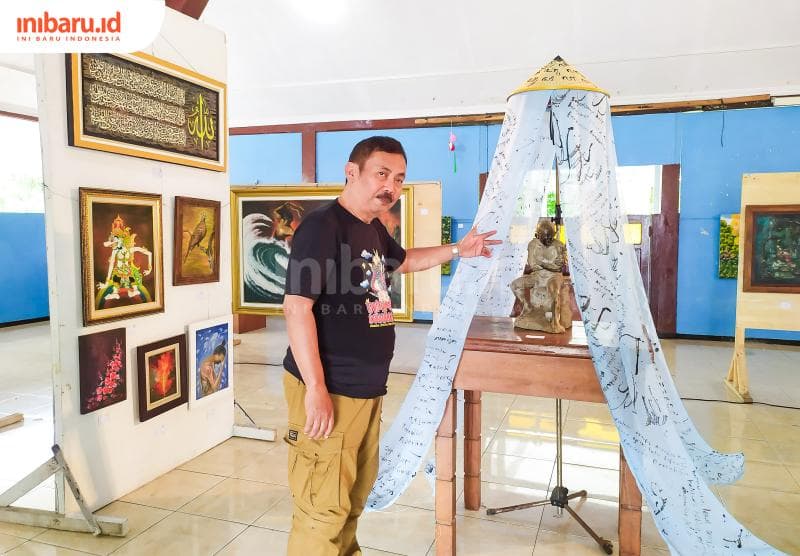 Putut Sulasmono selaku Ketua Dewan Kesenian Pati menunjukkan karya seni yang dipamerkan di lokasi acara. (Inibaru.id/ Rizki Arganingsih)