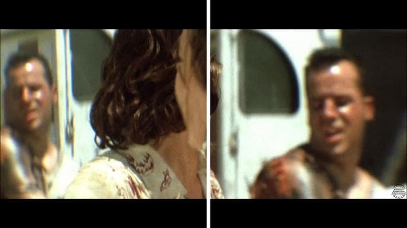 Di tengah kepanikan dan suasana duka, seorang lelaki melintas di latar belakang. Gayanya, wajahnya, dan cara berjalannya sangat mirip dengan John McClane, karakter ikonik yang diperankan Bruce Willis, lengkap dengan kaus kaos putih kotor dan penuh luka.