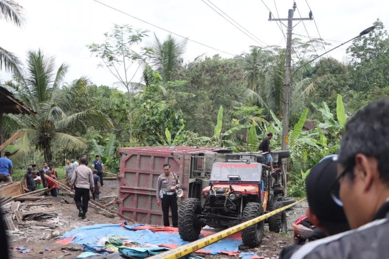 Akibatnya, truk menyenggol kopada dan menyebabkan kedua kendaraan terguling hingga menabrak rumah warga di pinggir jalan.