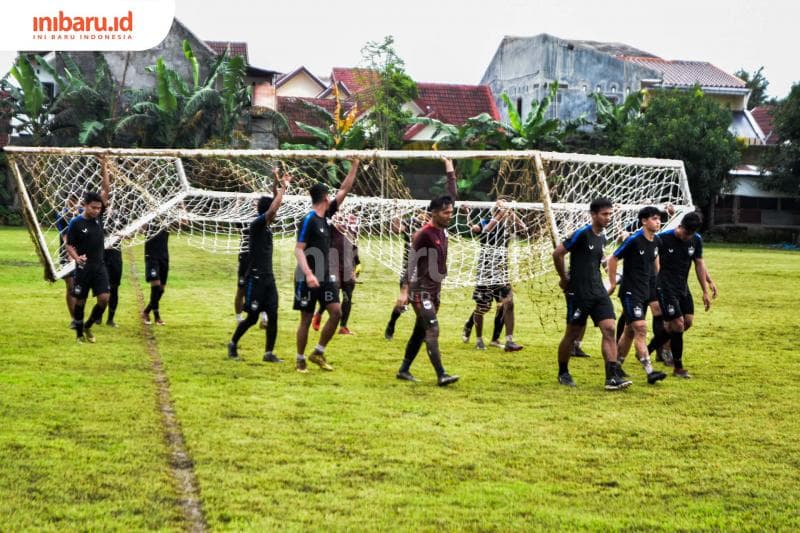 Para pemain PSIS mengangkat gawang usai latihan. (Inibaru.id/ Audrian F)<br>
