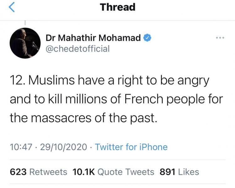 Muslim memiliki hak untuk marah dan membunuh jutaan orang Prancis atas pembantaian di masa lalu," tulis Mahathir dalam akun Twitternya dikutip dari Reuters, Jumat (30/10/2020).