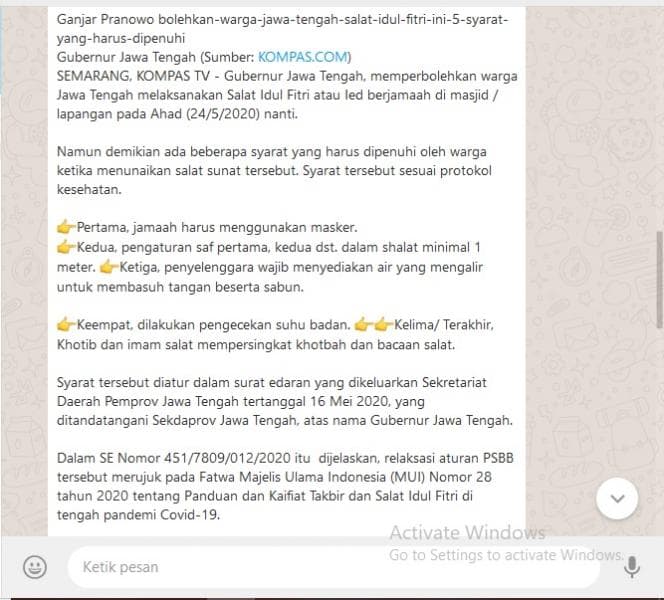 Inibaru.id - Imbauan tentang pelaksanaan salat idulfitri di Jawa Tengah diombang-ambingkan dengan beredarnya pesan berantai di media sosial. Dalam pesan tersebut tertulis bahwa Pemerintah Provinsi Jawa Tengah memberi izin pelaksanaan salat Idulfitri di masjid atau di lapangan asal menepati beberapa syarat, seperti menggunakan masker sampai pengaturan saf atau barisan salat.