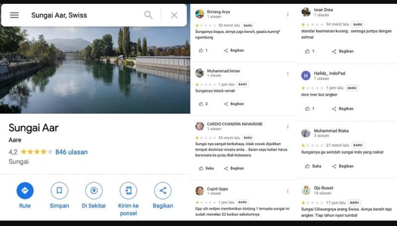 Inibaru.id – Warganet Indonesia memang dikenal paling bar-bar dan terkadang sering melakukan hal-hal yang mengherankan. Kali ini, ‘kekompakan’ warganet Indonesia dituangkan dengan memberikan ulasan dan rating buruk pada Sungai Aare yang ada di Swiss, sungai tempat anak Ridwan Kamil, Emmeril Khan Mumtadz atau Eril, hanyut dan belum ditemukan hingga sekarang.