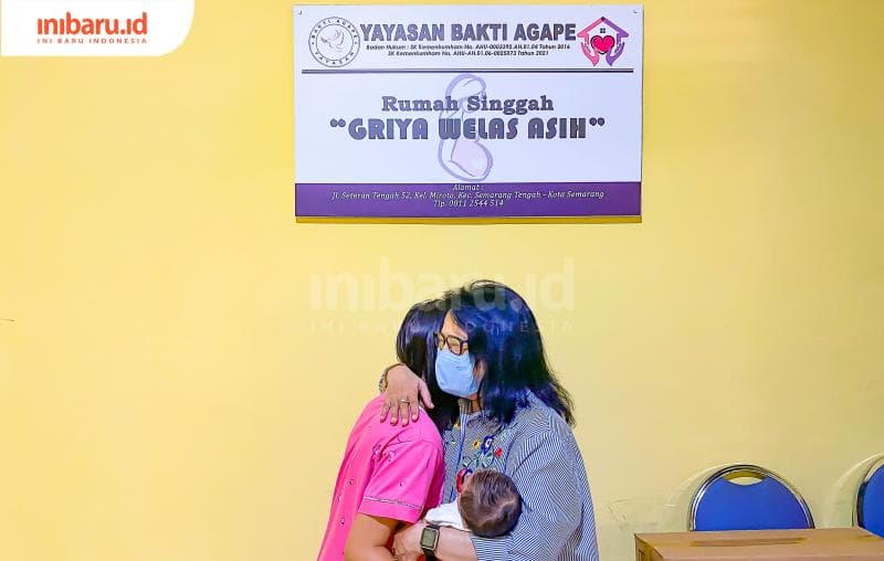 Rosalia Amaya memeluk kliennya, seorang perempuan muda yang sedang memulihkan diri sebelum melahirkan di Griya Welas Asih. (Inibaru.id/ Kharisma Ghana Tawakal)
