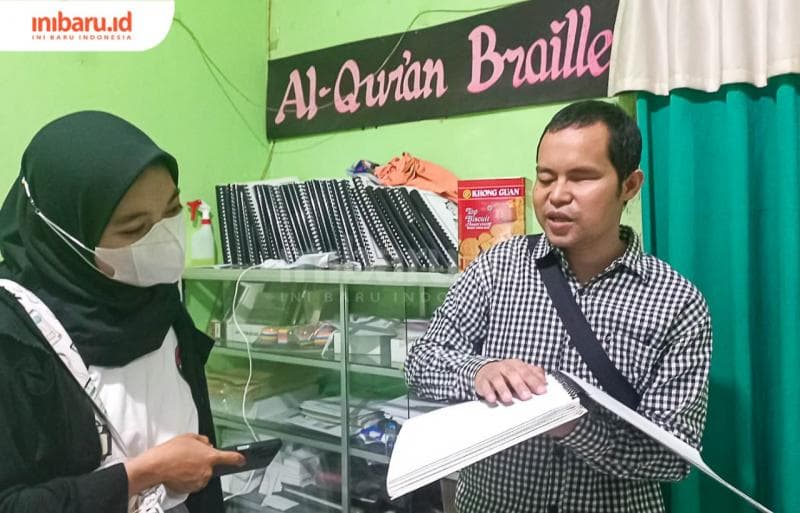 Sopyan, anggota Komunitas Sahabat Mata, sedang menunjukkan kemampuannya membaca Al-Quran Braille. (Inibaru.id/ Fitroh Nurikhsan)