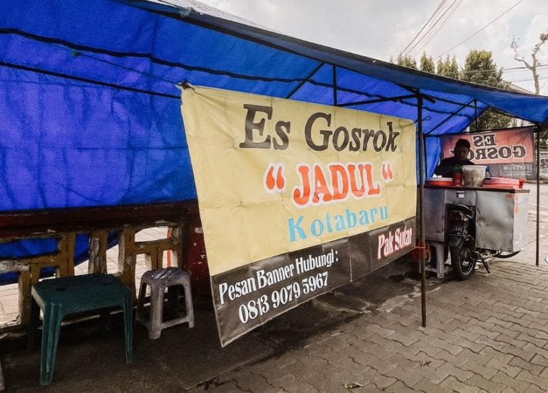 Es Gosrok Jadul Pak Sutar ini bisa kamu temui di kawasan Kotabaru, tepatnya di Jalan Abu Bakar Ali, dekat dengan Stadion Kridosono, Yogyakarta. Pengelolanya adalah laki-laki asli Gunungkidul bernama Sutaryono.