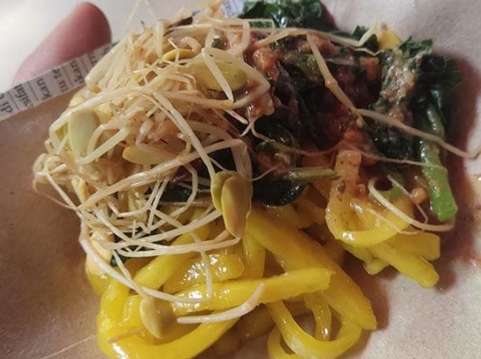 Yang menarik dari penyajian mi pentil adalah terkadang penganan ini disajikan dengan sayuran pecel dan diguyur dengan sambal kacang.