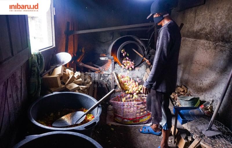 Penasaran dengan cara menggoreng yang katanya unik, saya pun beruntung bisa menyaksikan secara langsung. Jangan bayangkan penggorengannya seperti wajan, ya. Penggorengan duibuat khusus berbentuk seperti molen. Di dalamnya berisi pasir yang sudah dipanaskan. Kerupuk mentah lalu dimasukkan ke dalamnya dan dibolak-balik hingga mengembang matang.