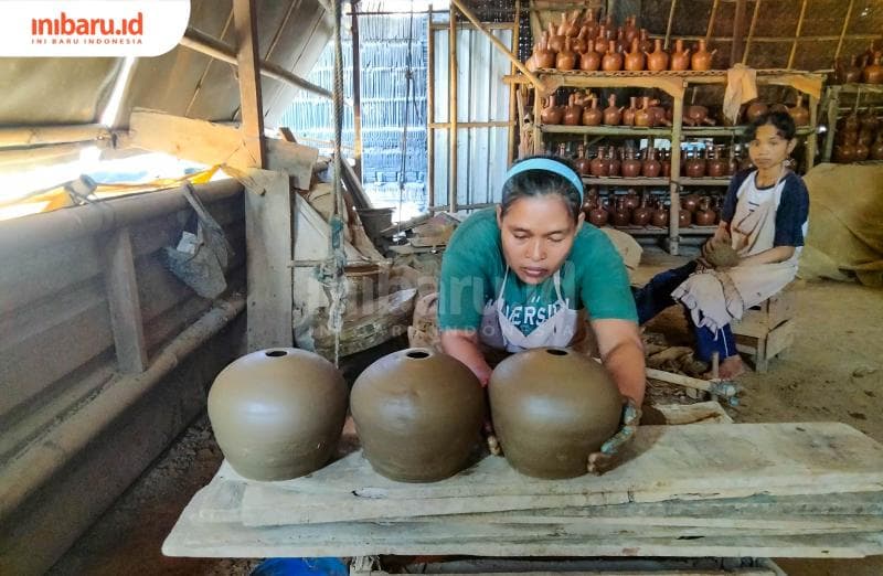 "Secara umum, pembuatan gerabah sama saja. Ada empat tahap, yaitu penyiapan tanah, pembentukan, penjemuran, dan pembakaran," terang perempuan 50 tahun tersebut. "Kendi dan cobek termasuk yang sulit dibikin, tapi banyak dicari."