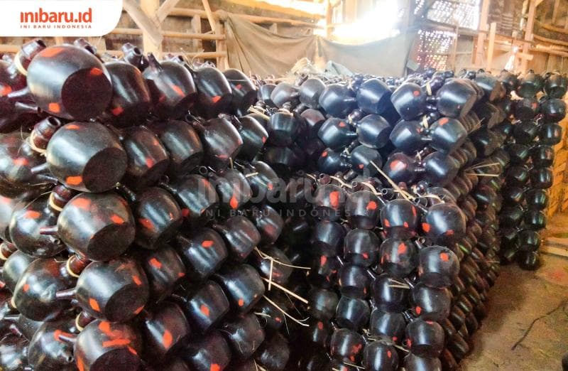 "Jika kayu sudah berubah jadi arang, pembakaran diganti memakai sekam yang asapnya bisa bikin kendi jadi hitam mengilap. Makin hitam, makin bagus," terangnya. "Pembakaran dilakukan per tiga hari, sekitar 1.000 kendi dan 1.000 cobek."