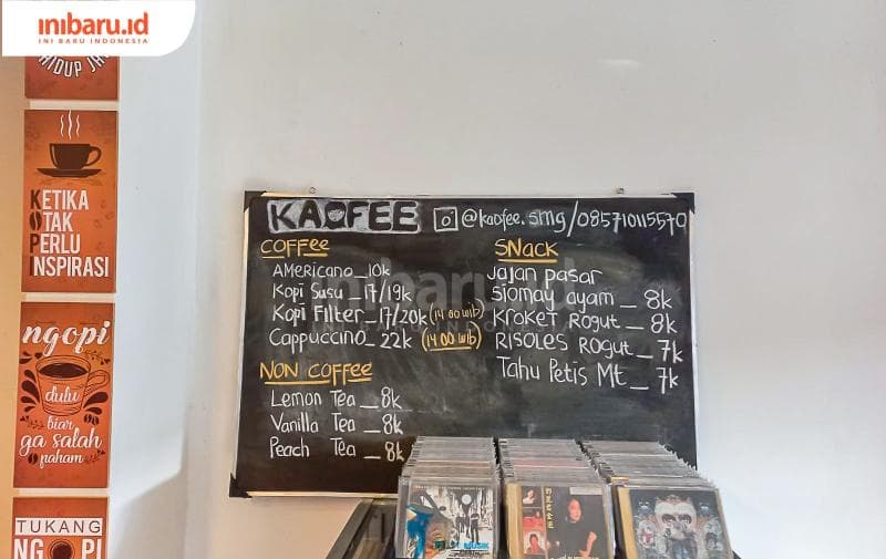 Berkunjung ke Kaofee untuk sejenak larut dalam nuansa era Sheila on 7 dan Linkin Park nggak perlu merogoh kocek dalam. Harga kopi, minuman non-kopi, dan camilannya cukup terjangkau kok, Millens. Kamu bisa datang saban hari sedari pukul 10.00 hingga 20.00 WIB.