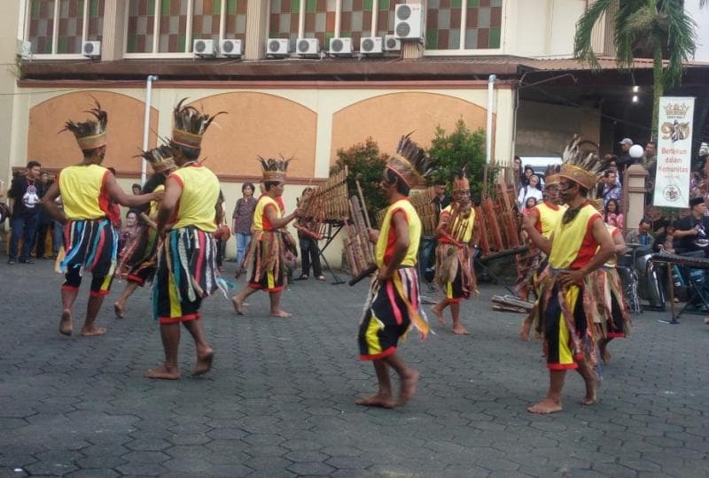 Ada satu hal yang membuat kesenian ini punya daya tarik tersendiri, yaitu dalam pementasannya, para penari harus membagi konsentrasinya untuk menari sambil memainkan alat musik. Kostum yang digunakan juga nggak biasa. Para penari menggunakan mahkota yang dihiasi bulu ayam dan menggunakan potongan kain pada celana yang menyerupai rumbai-rumbai.