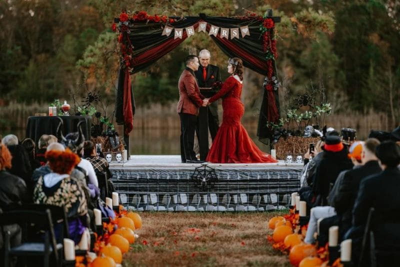 Konsep pernikahan 'halloween wedding' diikuti dengan tamu undangan yang mengenakan dress code yang sesuai. (United Elite Photography via Wezoree)