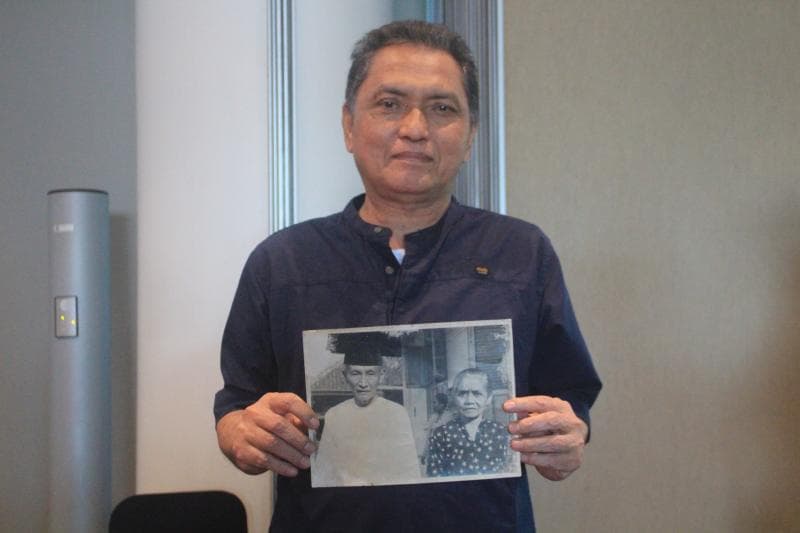 Rohayat, cucu dari Djamhari sedang menunjukkan foto Djamhari yang dia bawa dalam Sarasehan Kretek. (Inibaru.id/ Imam Khanafi)