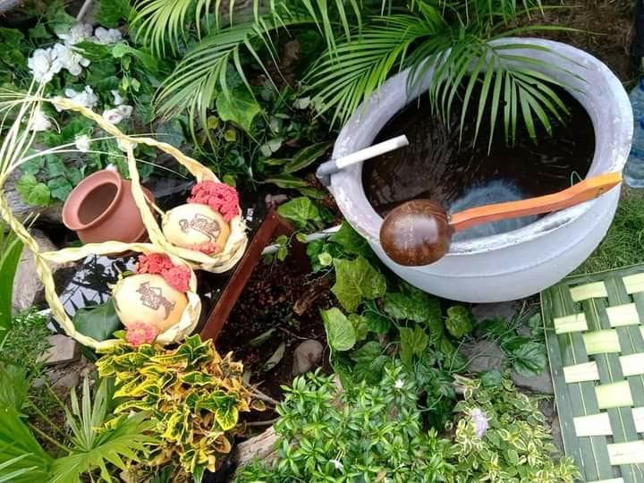 Dua kelapa yang dikuri tokoh pewayangan dengan gentong dan gayung dari tempurung kelapa bergagang kayu kemuning. (Twitter @Allwahid805)